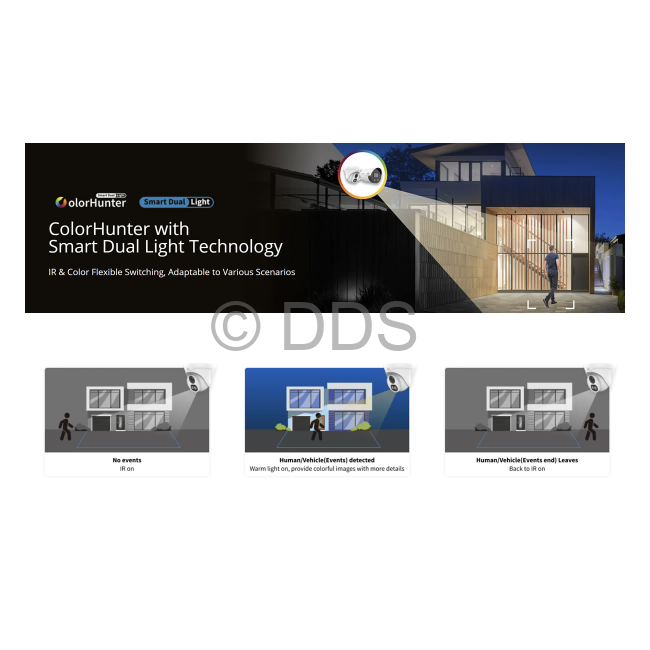 - Supports Dual Light (using white light when an event is triggered, otherwise uses IR)