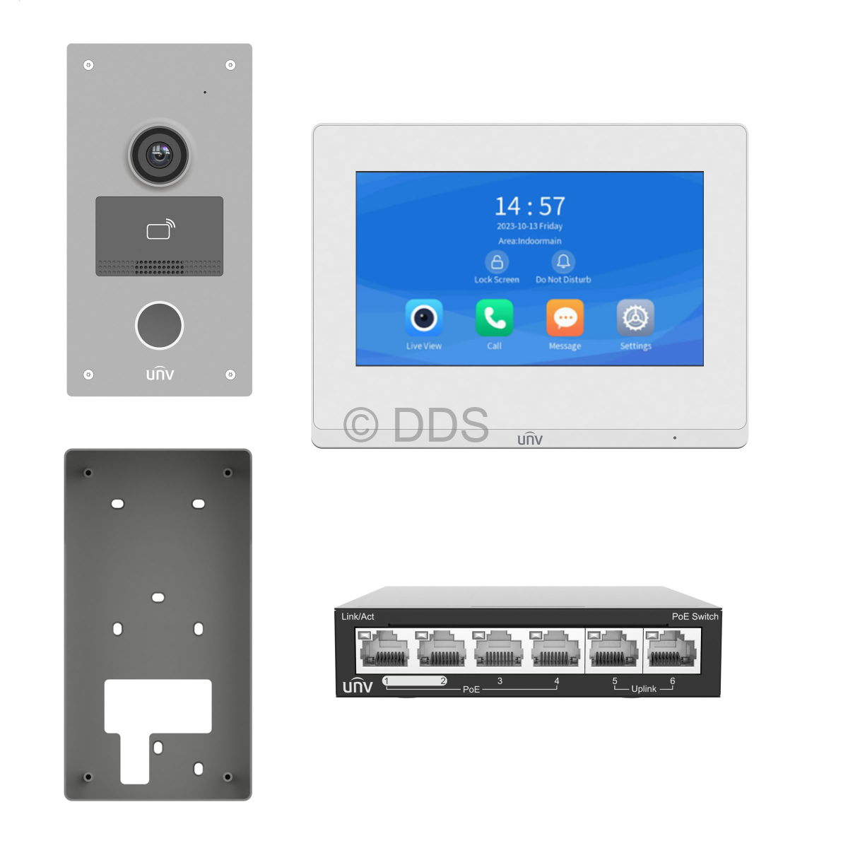 The Uniview video intercom kit comprises of the indoor monitor (OEI-372S-H-W-Z), outdoor station (OEU-201S-HMK-Z) and a 4 port POE switch (NSW2020-6T-POE-IN). The kit supports calls with the indoor monitor and to the app and also supports remotely opening doors/gates. The outdoor station features an IC card reader which supports 13.56MHz credentials. The outdoor station features a 2MP camera and infrared.